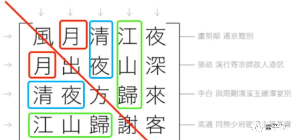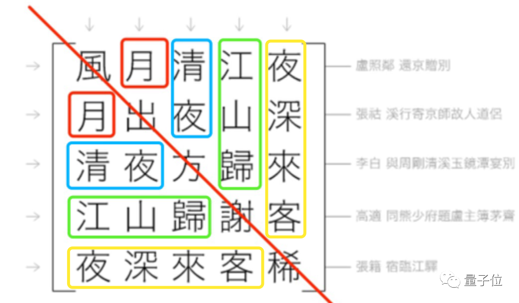 其一,以五言诗为例,第五列的前4个字,和第五行的前4个字,内容是否完全一样?如果不一样,就扔掉。