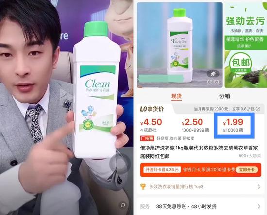 辛巴给该洗衣液定价9.9元,但很快有人扒出,同款洗衣液在阿里巴巴上的批发价最低可达1.99元。此外,该包装的洗衣液并无明显品牌标识,疑似代工厂生产。