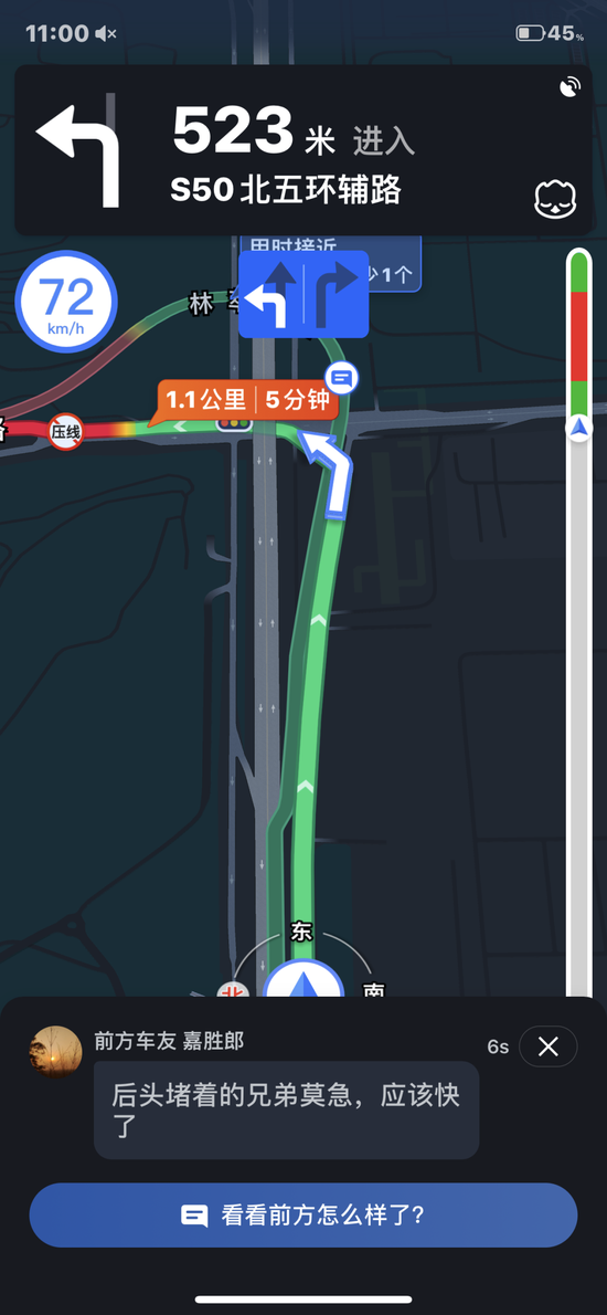 当时,我堵在路上,导航中的高德地图,突然弹出一条推送,“前方车友嘉胜郎向你发来信息:后头堵着的兄弟莫急,应该快了”,点进去就是这样的群聊界面,只是没清明返城时那么热闹罢了。