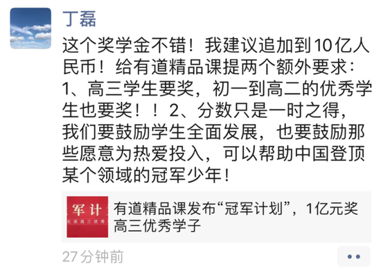 就在半个月前,丁磊在朋友圈宣布,加码有道精品课推出推出的“冠军计划”,设10亿奖学金,鼓励从初一到高三所有优秀学生为热爱投入。此举一出,就收割了一波社交媒体平台上的流量,还引发了对教育评价改革等话题的讨论。