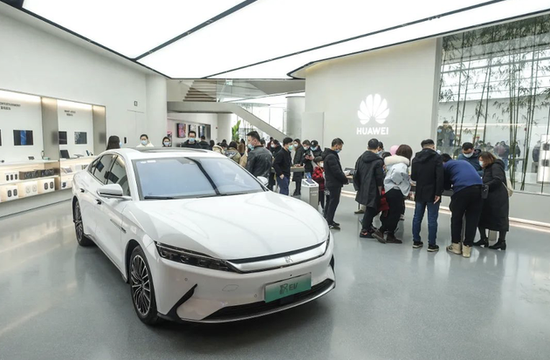 在繁华的南京路步行街东侧,华为全球唯二的旗舰店落店于此,与苹果、三星相遇在闹市路口。颇为显眼的是,入店口停着一辆白色比亚迪汉,上面搭载HI华为智能汽车解决方案。
