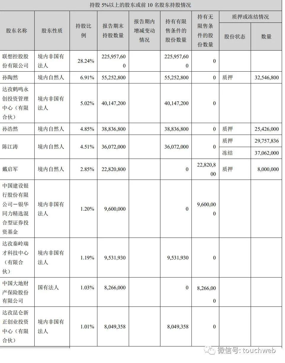 截至2020年12月31日,联想控股持股为28.24%,为第一大股东;孙陶然持股为6.91%,为第二大股东;达孜鹤鸣永创投资管理中心(有限合伙)持股为5.02%;