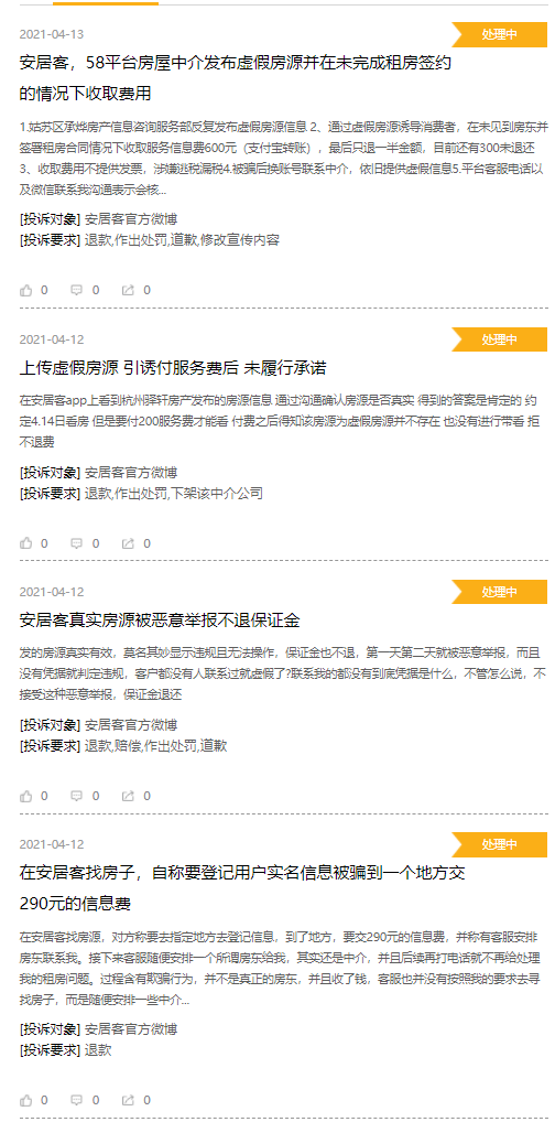 而事实上,在安居客上被套路过的年轻人不在少数。打开黑猫投诉,可以看到与安居客相关的投诉中,虚假房源、乱收费等相关的不在少数,并且每个月都有相关类似投诉增加。