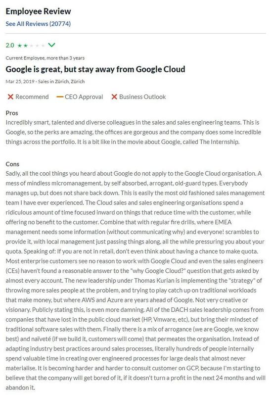 一位谷歌云员工在 Glassdoor 上这样评价东家: