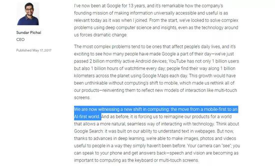2017年,Pichai 发文指出,世界正在经历一次重大的科技转型,从移动优先转向 AI 优先。