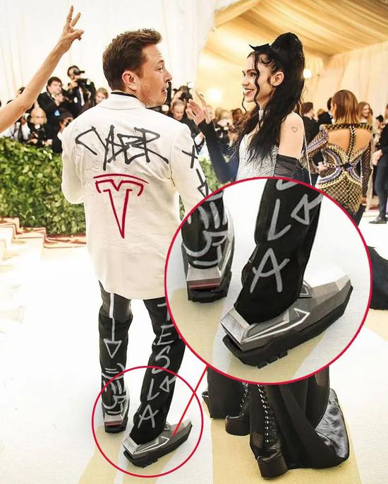 2020年初,他们发布了一张埃隆·马斯克(Elon Musk)参加2018年纽约大都会艺术博物馆慈善舞会的加工图片,迅速引发热议。在那张图片中,RTFKT工作室以特斯拉电动皮卡“Cybertruck”为设计灵感,为马斯克打造、“穿上”了一双极具赛博朋克风格的鞋子。尽管那是一张加工图片,但图片发布后不少人都在问哪里能买到这双鞋,甚至有人提出要花4万美元买这双鞋子。