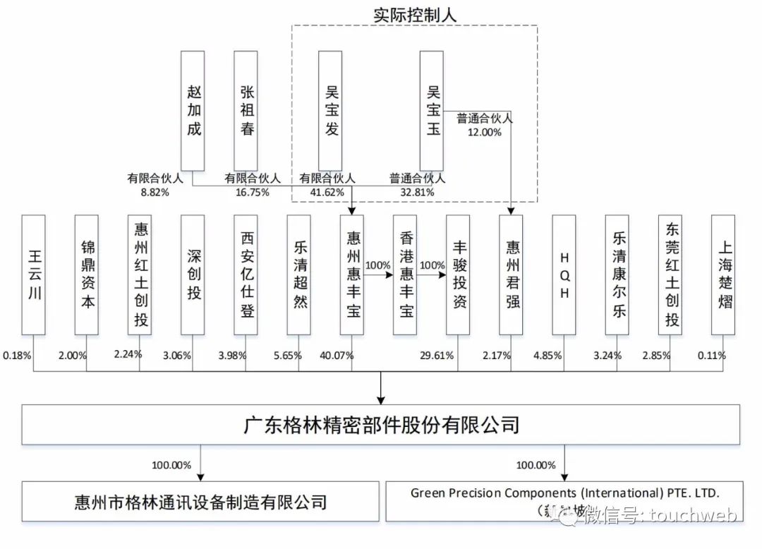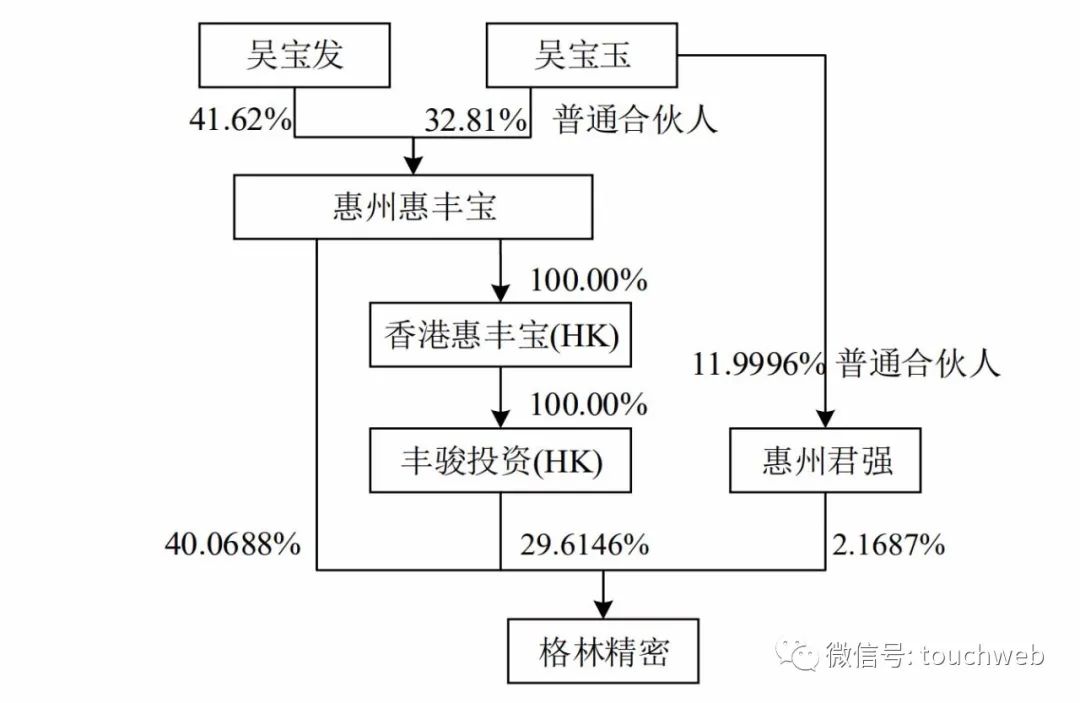 IPO前,格林精密实控人吴宝发、吴宝玉兄弟,通过惠州惠尔宝、丰骏投资和惠州君强共间接持有公司52.1256%股权,及71.8521%股份的表决权。