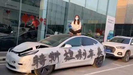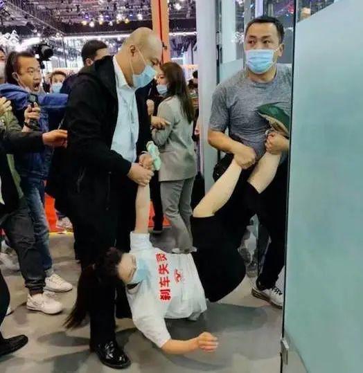 特斯拉的工作人员起初以雨伞遮挡的形式,挡住该女士,避免现场状况被围观群众拍到。但是该名女士情绪激动,夺过工作人员手中的雨伞,砸到车上。随后车展的安保人员到场,该名车主被安保人员强行拖走。