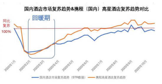 携程从2020年4月便领先于行业开始复苏趋势。粗略来分,2到4月为回暖期,4到8为复苏期,8到12月为反弹期。