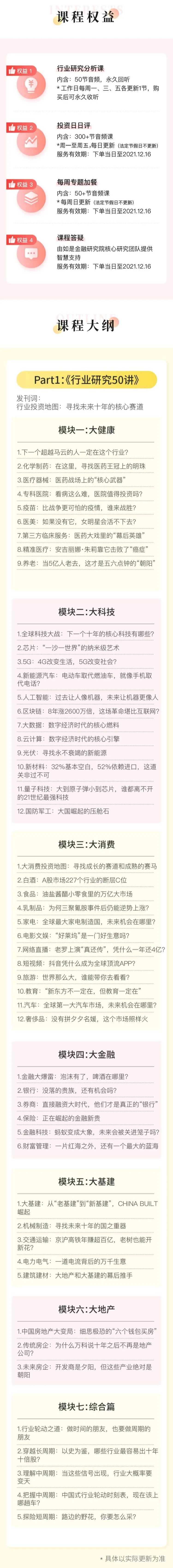 除了每个工作日的固定更新,每周日还有一场直播,带你了解最新的市场行情。当然,在这门课中还有50节音频课程,内容是对40多个细分行业的投资逻辑、产业链、龙头企业的科普,从长、中、短周期角度进行分析,总计超过350节课。