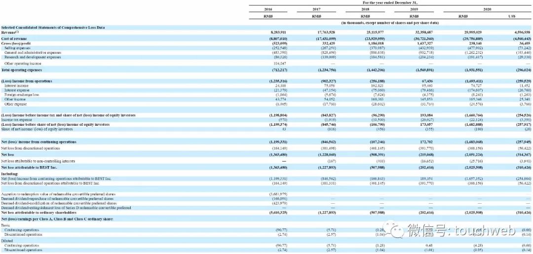 百世集团2018年、2019年、2020年净亏损分别为-5.08亿元、-2.19亿元、-20.51亿元(约3.13亿美元)。