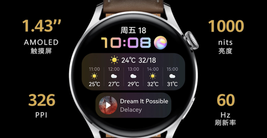 在硬件配置方面,华为 Watch 3 Pro 搭载了一块 1.43 英寸 OLED 屏幕,屏幕 PPI 为 326,机身采用钛合金打造,表面为蓝宝石材质。