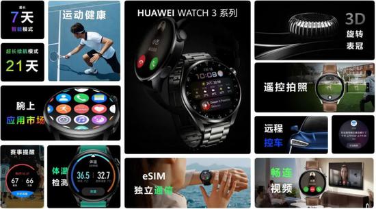 此次华为还推出了首款搭载鸿蒙 OS 的智能手表华为 Watch 3 系列。在鸿蒙 OS 加持下,华为 Watch 3 的交互相应更快,并且操作体验跟手机有一致性,比如支持下滑、负一屏等。