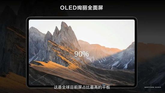 首先作为一款平板电脑,最突出直观的就是其屏幕。MatePad Pro 搭载了一块 12.6 英寸的 OLED 屏幕,其屏占比达到了 90%,边框仅为 5.6mm,正面观感非常具有视觉冲击力,据称也是目前全球屏占比最高的平板电脑。