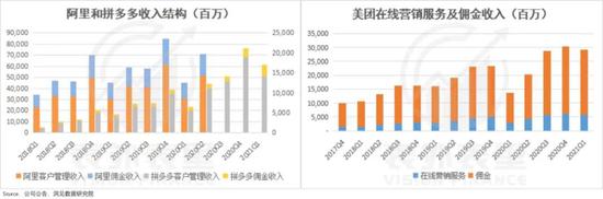如下图,阿里、拼多多等平台的收入来源,主要由客户管理收入和佣金收入(交易服务费)两部分构成,其占大头的客户管理费,基本来自广告营销收入。