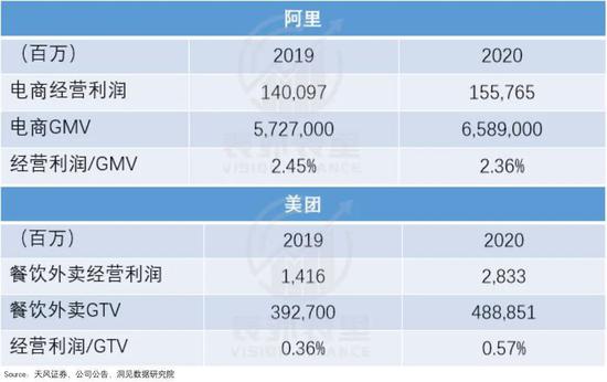 我们从经营利润与主要业务交易金额的对比上发现,2020年阿里的经营利润/GMV是2.4%,美团的该数据为0.57%。