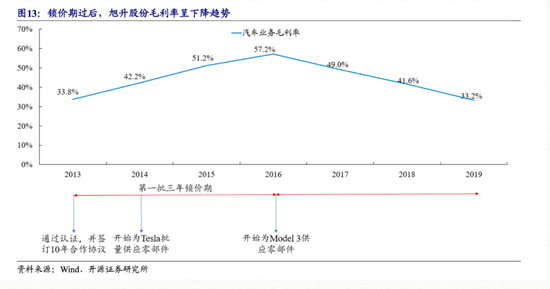然而,一边是营收的增长,另一边则是毛利率的急速下滑:2016年起,旭升对特斯拉的汽车业务毛利率一路从57.2%下滑到了2019年的33.2%。