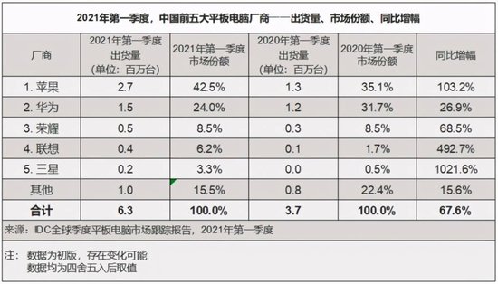 根据IDC发布的《2021年第一季度中国前五大平板厂商——出货量、市场份额、同比增幅》报告显示,苹果在2021年Q1国内平板电脑的出货量为270万台,占据了42.5%的市场份额,同比增幅为103.2%。紧随其后的是华为,出货量为150万台,市场份额为24%,同比增幅26.9%。