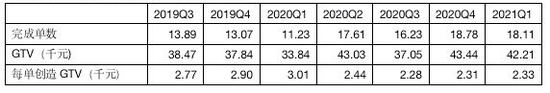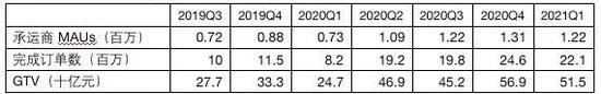 考虑到疫情影响,这段时间增速放缓并不奇怪,满帮的招股书最奇怪的地方,在于承运商、完成订单数和GTV之间微妙的关系。满帮提供的从2019Q3至2021Q1的相关数据如下: