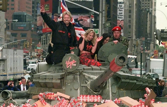 为了让维珍可乐打入美国市场,他曾坐在一辆二战的坦克上,一路碾压可口可乐,开进时代广场,向可口可乐宣战;为了给维珍手机制造营销噱头,他居然和20名模特们裸体出现在伦敦街头。