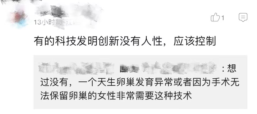 却遭到了他人的反驳:「想过没有,一个天生卵巢发育异常,或者因为手术无法保留卵巢的女性非常需要这种手术。」