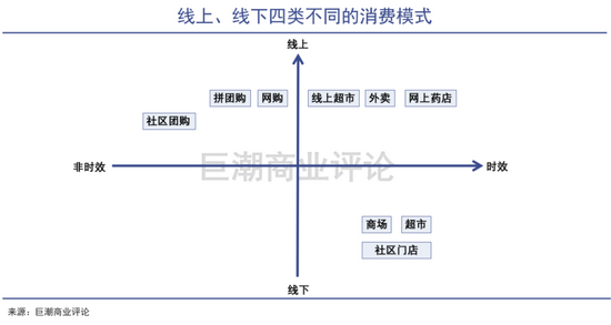 传统商超、线下百货、各类餐饮门店身处线下,但时效性强,去了就能把商品带回来,或者享受服务,属于线下+时效;
