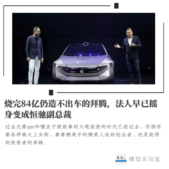 拜腾的发展与它的前辈尤其像,那就是贾老板手上凉透的乐视“全家桶”(包括乐视网、乐视影业、乐视新媒体等),还有靠恒大接盘的法拉第未来。身处热门赛道,老板画大饼的能力一流,靠着几版ppt,就能让投资者心甘情愿掏腰包,生怕错过了风口。