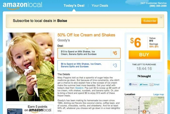 本地亚马逊(Amazon Local)近似于团购网站Groupon、Livingsocial,主打每日特卖(Daily Deals)业务,于2015年被关停,原因很简单,没竞争过Groupon,于是被亚马逊“痛下杀手”了。