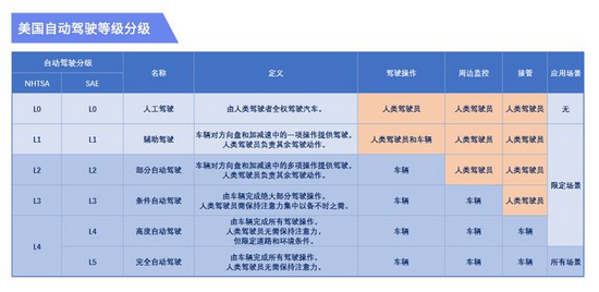 关于自动驾驶的分级标准,目前全球汽车行业公认的有两个,一个是美国高速公路安全管理局(简称NHTSA)提出的,一个是国际自动机工程师学会(简称SAE)提出。