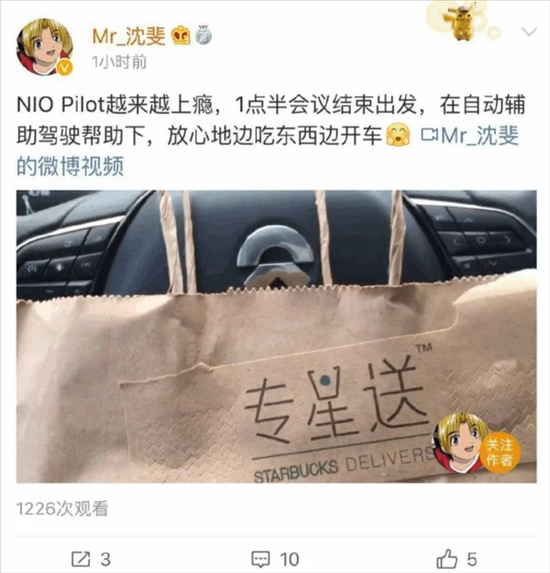 2019年8月22日,蔚来汽车副总裁沈斐在微博上发布了一段小视频,表示NIO Pilot(蔚来自动辅助驾驶)越来越上瘾,1点半会议结束,在自动辅助驾驶帮助下,放心地边吃东西边开车。当时就有网友表示,这是个不好的错误示范,如果车友模仿的话,极易引起交通事故。