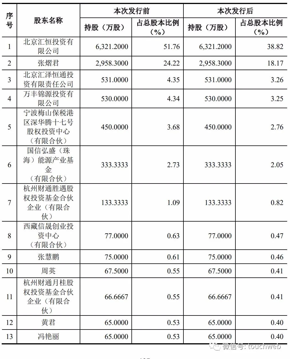 张熠君持有控股股东汇恒投资99.80%的股权,通过汇恒投资间接持有公司6,321.20万股股份,占公司发行前总股本的51.76%。