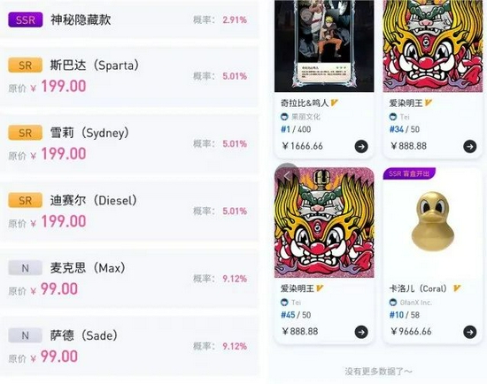其中小黄鸭盲盒包括9款N卡人物,每款占比9.12%,合计占比82.08%。三款SR卡,每款占比5.01%,合计占比15.03%。一款SSR卡,占比2.91%。