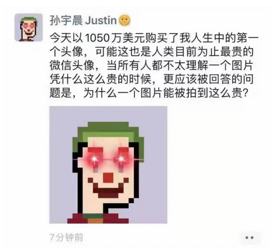 前几天,加密货币流量收割机孙宇晨在朋友圈炫耀了自己买的NFT作品,此作品花了1050万美元,被称为史上最贵的微信头像。