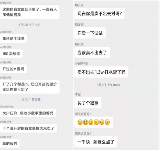 NFT微信群中“NFT爱好者”在NFT微信群中讲诉“自己1.3万买的NFT头像卖不出去,自己的积蓄都打了水漂”。