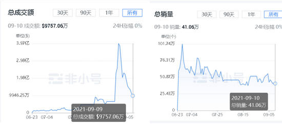 NFT商品缺乏流动性除了在日常售卖中有所体现,更多的证据还体现在成交数据中。
