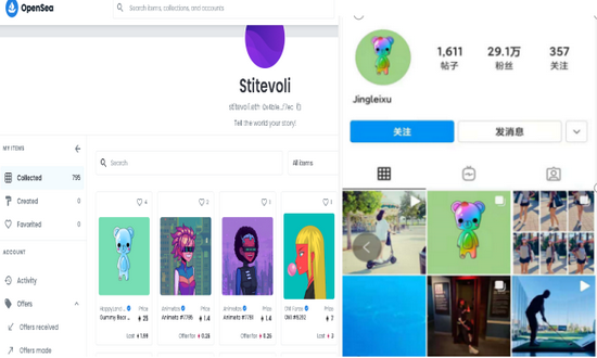 我通过追踪徐静蕾Instagram账户发布的NFT头像发现,徐静蕾Opensea(NFT交易平台)账户名称是Stitevoli。账户地址为0x4b1e684d5143eb7435e5d78385fa8cbdccd8f7ec。