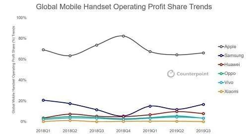 可最关键的销售额或利润方面,苹果的表现还是亮眼的。2020年iPhone一季度的销售额为289.62亿美元,Counterpoint公布过2019年第三季度的数据,苹果的利润高达80亿美元,占行业66%,几乎是国产手机四大品牌的总和,就连销量长期第一的三星也只有20亿美元。