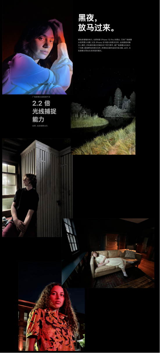 iPhone 13 Pro和iPhone 13 Pro Max的镜头也有了一系列的提升。在iPhone 13 Pro系列中,同样配备了传感器防抖技术。全新77mm长焦镜头支持3X的无损光学变焦,超广角镜头的光圈升级到了更大的F/1.8并且支持自动对焦,且在低光拍摄的场景下进光量提升了92%;全新的广角主摄光圈提升到了F/1.5,超广角镜头支持2厘米的微距摄影。在镜头技术的提升下,iPhone 13 Pro和iPhone 13 Pro Max具备了全系的夜间拍摄夜景能力,拍出来的照片不会太有颗粒感。