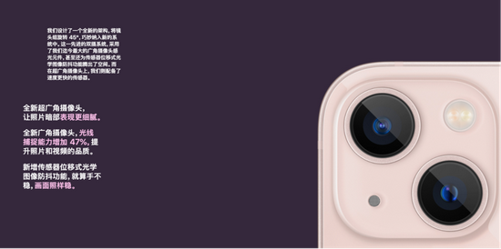 在iPhone 13 mini、iPhone 13中,苹果调整了后置摄像头的布局。从原先的左侧竖直排列变成了对角线布局,以使得镜头内能塞下iPhone 12 Pro Max同款传感器位移式光学防抖。主摄广角镜头采用了1.7微米的尺寸,1.6的光圈,提升了47%的进光量。超广角镜头提供120度的视角,采用2.4的光圈。全新的摄像头配置能够帮助手机在暗光环境下获得更好的照片拍摄效果。