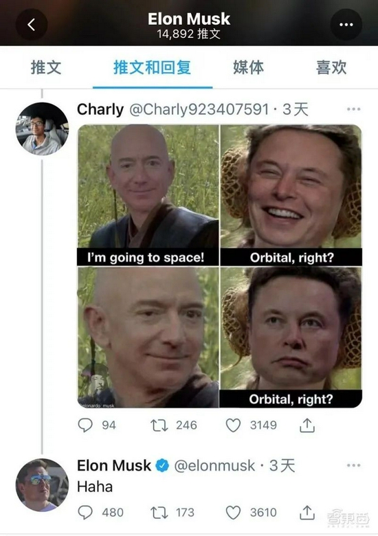 之前,马斯克还跟贝佐斯开过玩笑,在推特上回复了关于贝佐斯飞行的表情包,评论“哈哈”。大概意思是说贝佐斯只是碰到了太空边缘,没有真正进入轨道。不过只是开个玩笑,马斯克后来也祝贝佐斯飞行顺利。