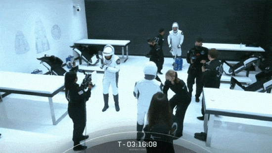 到达SpaceX猎鹰火箭支持大楼后,四位宇航员开始穿着宇航服,并进行一些适应调整工作。