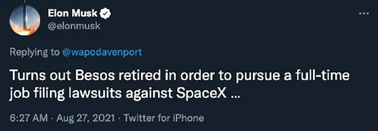后来亚马逊抗议SpaceX增加互联网卫星的计划,以及多次对SpaceX获得月球着陆器合同一事提出抗议,马斯克发推特踩贝佐斯说,贝佐斯退休是为了对SpaceX提起诉讼的全职工作(现在看已经删掉了)。