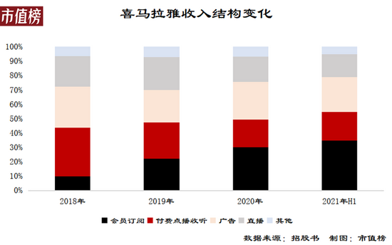 喜马拉雅的收入来自四部分,订阅、广告、直播和其他。订阅收入是顶梁柱,2020年占收入的比重为49.2%,2021年上半年为54.6%,其次是广告和直播,分别占总收入的24.5%和16%。
