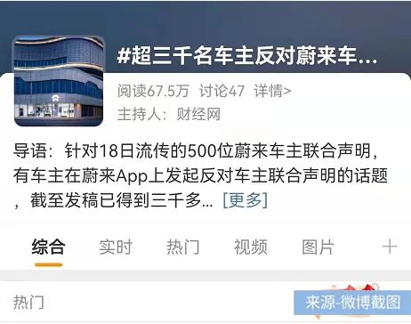 截至2021年10月11日,新浪微博#超三千名车主反对蔚来车主联合声明#词条阅读量达67.5万次。