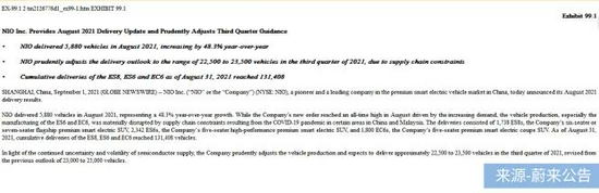 9月1日,蔚来曾公告下调交付预期,将此前预计2021年第三季度交付量修订为约22,500至23,500辆。