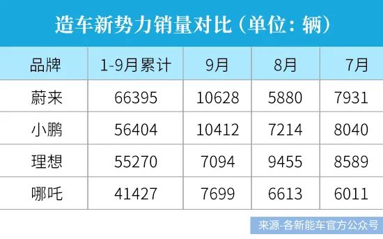 根据最新公布的销售数据:9月,蔚来在全球交付10,628辆汽车,重回新能车月销量榜首;小鹏紧随其后,9月销量同样破万,与蔚来仅相差216辆。