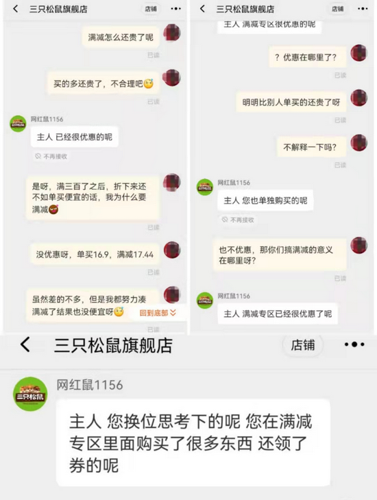 对于这种满减之后价格比单买还要更高的现象,我特意去咨询了一下律师,毕竟三只松鼠的客服“网红鼠1156”应该是不打算跟我好好说话了。律师给到的回复是:“由于目前就此并没有直接的法律规定,我们也只能从消费者权益保障法价格欺诈的角度来主张。”
