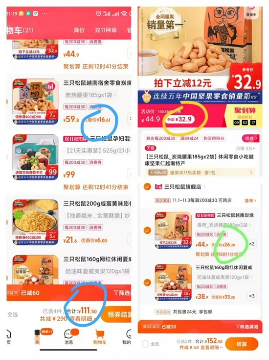 结果也并没有划算。为了避免商家所谓的薄利多销的说法,我们以相同SKU的炭烧腰果为例,同样185g的腰果,都是两包,满400减290按满减优惠最大化原则进行凑单之后,折算每包16.61元(蓝色),聚划算如单买折算则是每包16.45元(黄色),如若进一步参加跨店满减的活动,则是每包13.19元(绿色)。