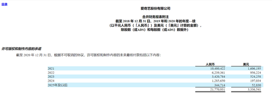 按照2020年年报给出的数据,2022年、2023年和2024年,爱奇艺需要支出的最低付款额分别为62.4亿元、34.2亿元和12.86亿元,合计109.5亿元。