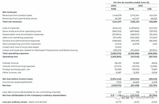 瑞幸咖啡2021年上半年净亏损为2.11亿元,较上年同期的净亏损15.52亿元收窄86.4%;Non-GAAP下净亏损为8400万元,较上年同期的净亏损15.39亿元大幅收窄。